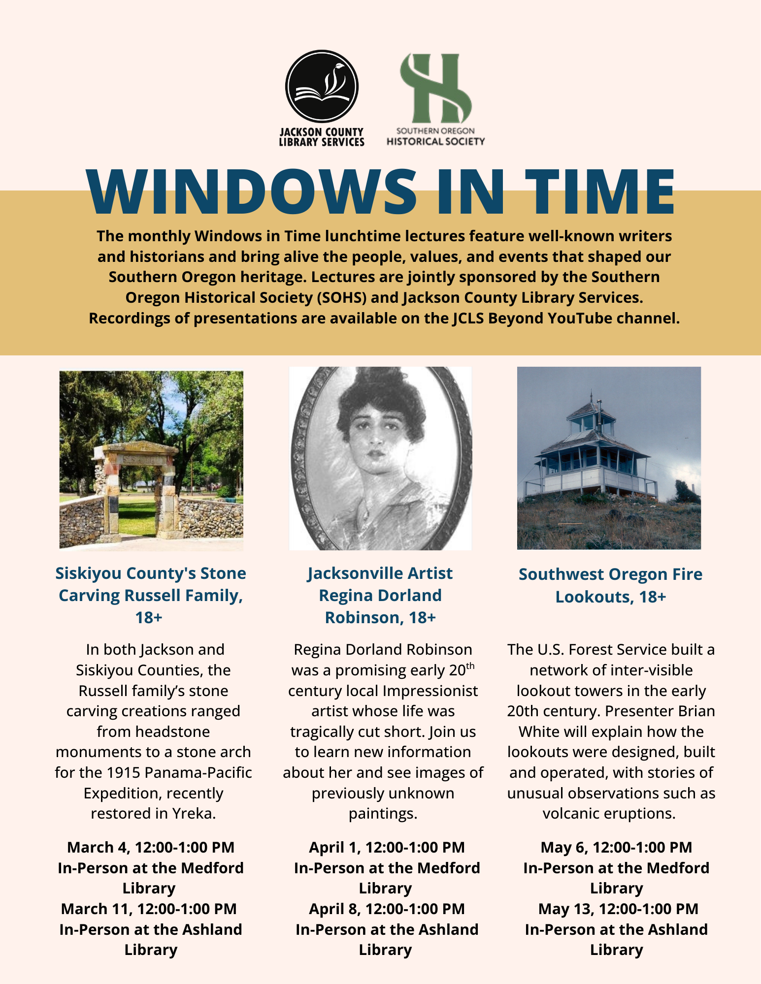 Get a unique look back through time at local history with the monthly Windows in Time lunchtime lectures, co-sponsored by JCLS and the Southern Oregon Historical Society. We’ve considered some truly fascinating topics over the years, from social and economic trends to architecture and commerce, as well as the people who have called the Rogue Valley home.